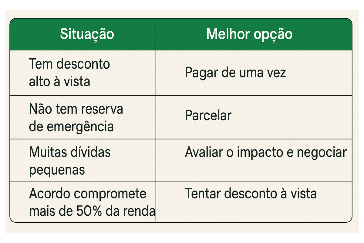 Se você tem o valor disponível, pagar todas as dívidas de uma vez pode ser uma decisão inteligente, que traz alívio imediato, descontos altos e recuperação do crédito. Mas é fundamental analisar com calma, para não trocar uma dívida por outra.